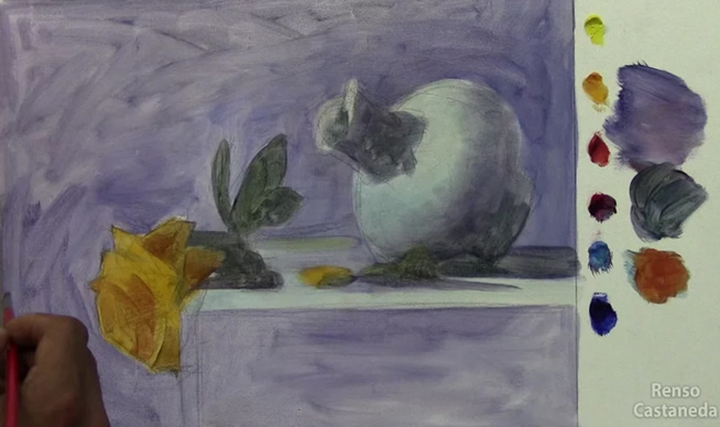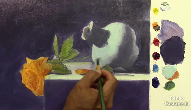 3.- Si pondremos atención al volumen, haremos mezcla de colores para las sombras así como para el color local del objeto pero las luces las obtendremos limpiando con un trapo el color del lienzo y dejando la transparencia del lienzo en blanco, así como se ve en la imagen.